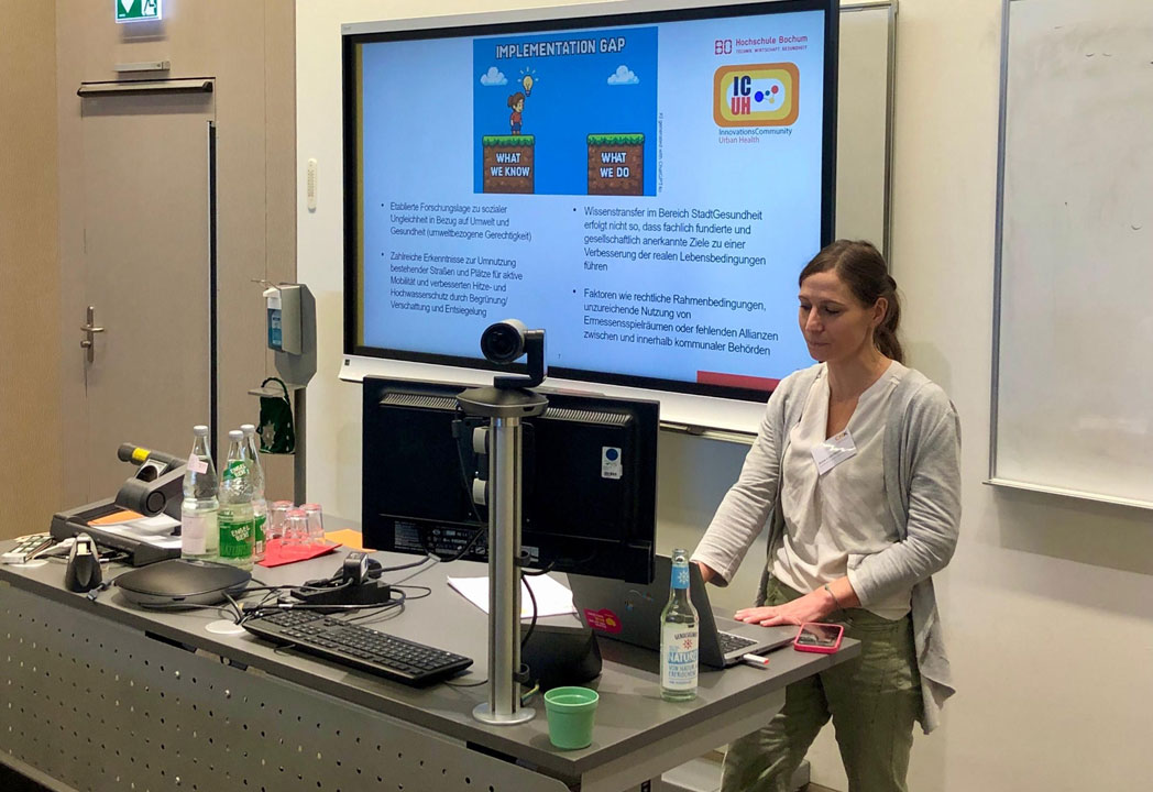 Prof. Dr. Heike Köckler hat das Fachforum als Sprecherin von ICUH moderiert. In einem ersten Beitrag ging es um die Struktur und Inhalte des Projekts: neben transdisziplinärer Strategieentwicklung, der Konzeption und Umsetzung des 1. Call for Ideas zu hitzeangepasster Stadtentwicklung mit einer Auswahl an vier Projekten im Ruhrgebiet und Bremen/Bremerhaven, ging es um eine Akteurs- und Netzwerkanalyse des Forum StadtGesundheit, auf dem ICUH im Ruhrgebiet aufbaut.